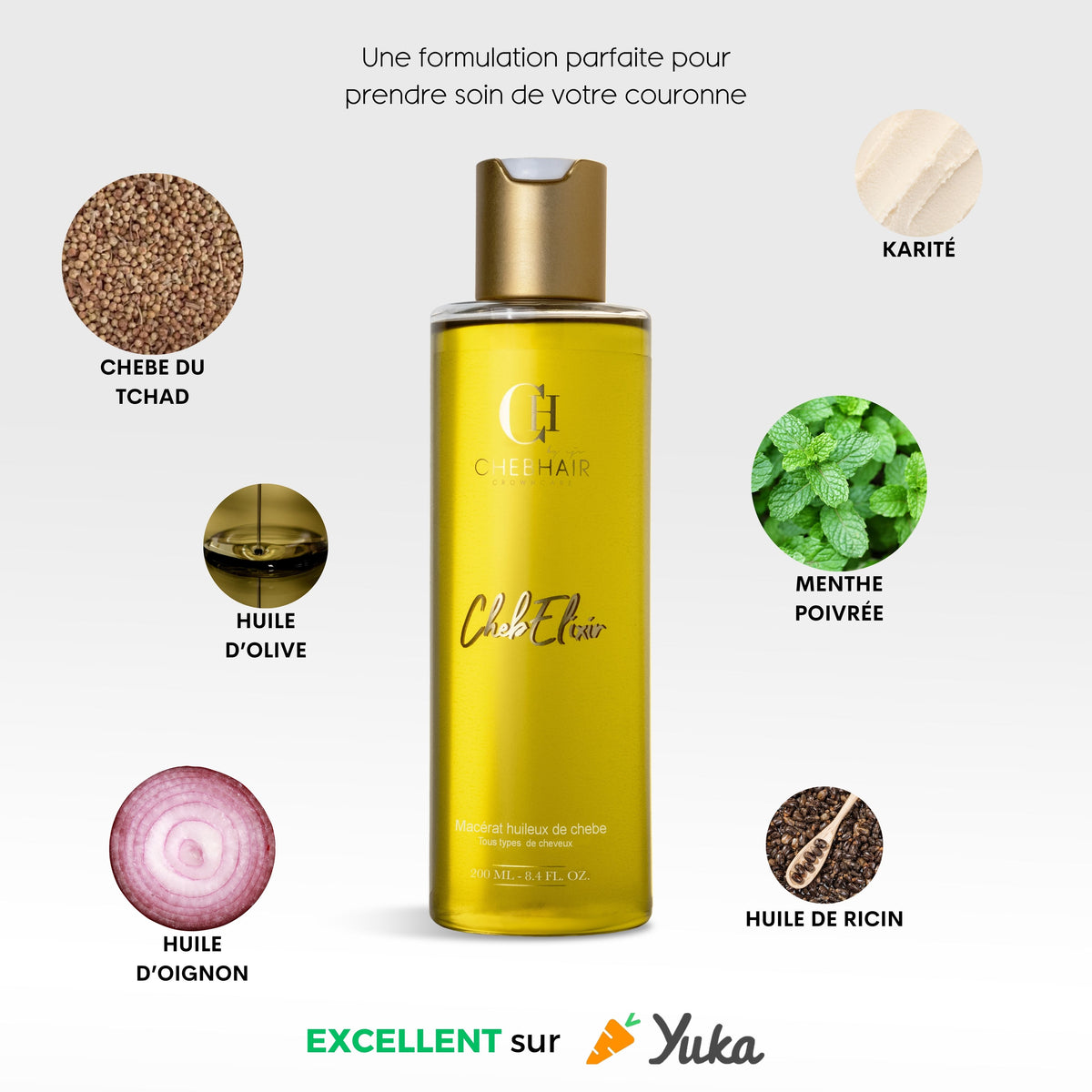 BUTYROSPERMUM PARKII OIL(karité/shea),RICINUS COMMUNIS SEED OIL(ricin/castor), ALLIUM CEPA BULB OIL(oignon/onion), OLEA EUROPAEA FRUIT OIL(olive), CROTON GRATISSIMUS SEED EXTRACT(chebe), MENTHA PIPERITA LEAF EXTRACT(menthe poivrée), CAPRYLIC/CAPRIC TRIGLYCERIDE, PARFUM, TOCOPHEROL(vitamine E/vitamin E), INULA CRITHMOIDE FLOWER/LEAF EXTRACT, LINALOOL