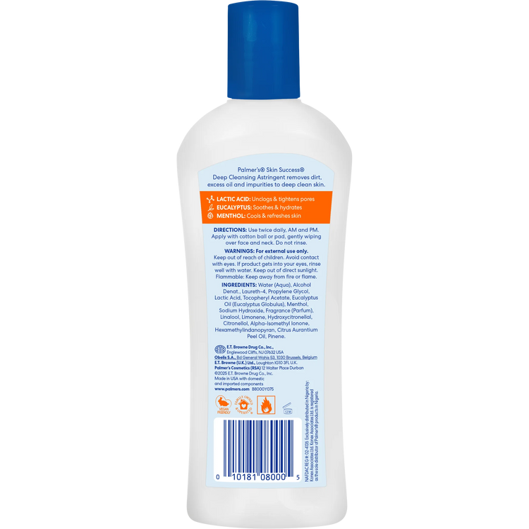Palmer’s Skin Success Deep Cleansing Facial Astringent unclogs pores and removes dirt, excess oil and make-up while refreshing, toning and revitalizing skin.